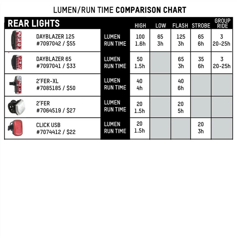 Set Dayblazer 550 Frontleuchte + Click USB Rücklicht. BIG LIGHT SET. SMALL PRICE. Suchen Sie ein einfaches, günstiges und helles Lichtset? Der DAYBLAZER 550 und Click USB sind genau das Richtige. Der DAYBLAZER 550 bietet unseren BLITZ-Tagfahrmodus, vielseitige Montagemöglichkeiten, hervorragende Seitensicht und das Click-Rücklicht bietet 20 Lumen Licht in einem winzigen Gehäuse.