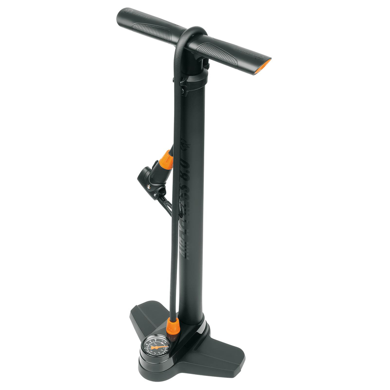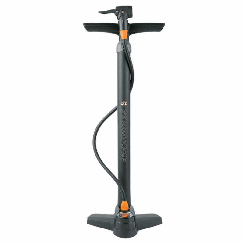 Die SKS Standpumpe Air-X-Press 8.0 bietet ein perfektes Preis-Leistungsverhältnis und überzeugt mit ihrem modernen Design. Auf dem matt-schwarzen Rohr kommt der hochglänzende Schriftzug perfekt zur Geltung, die Führung des verlängerten Schlauches sorgt für einen aufgeräumten Look. Die geriffelte Oberfläche des Griffes erlaubt einen sicheren Halt beim Pumpen und zeichnet sich durch eine angenehme Haptik aus.