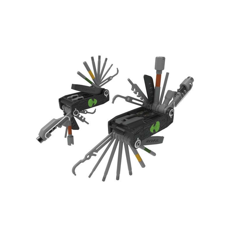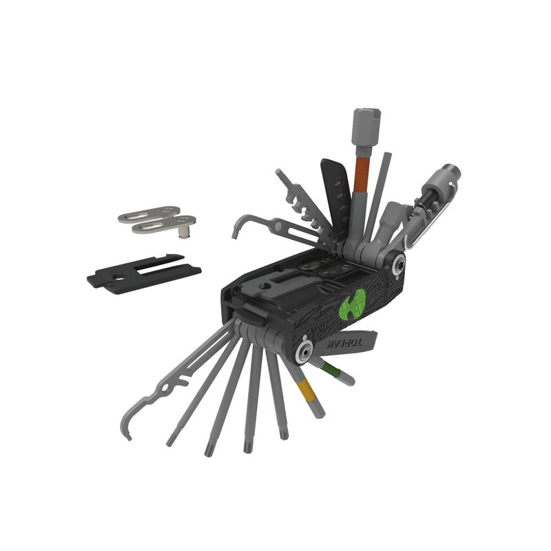 Das Alien-Logo steht bei Topeak seit jeher für Multi-Tools mit gewaltigem Funktionsumfang. Mit dem Alien X wurde der grüne Bolide nochmals um einige Funktionen erweitert und protzt nun mit satten 38 Features. Vom Schraubendreher bis zum Reifenheber sind hier so ziemlich alle Schlüssel, Pannenhelfer und Spezialwerkzeuge an Bord, die du unterwegs für kleinere Reparaturen und Wartungsarbeiten benötigst. Das bewährte zweiteilige Design kommt dabei nicht nur der Handlichkeit, sondern auch dem Funktionsumfang zugute. So bringt das Alien in der X-Version erstmals auch ein Presta-Ventilwerkzeug, den Niet-Amboss für Campagnolo Hollow Pin Ketten, einen Speichenhalter sowie ganze fünf Innensechsrund-Schlüssel mit. Sogar ein zweiteiliges Kettenschlosswerkzeug nebst Staufach für ein Kettenschloss hat Topeak beim Alien X verwirklicht. Damit ist das Multitool nicht nur ein Alleskönner für unterwegs, sondern wird garantiert auch in deiner Heimwerkstatt einen festen Platz einnehmen.